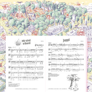 23 Songs zum Mitsingen oder Spielen auf euren Instrumenten – und einem fantastischen Wimmelbild von Julien Gründisch zum Ausmalen.